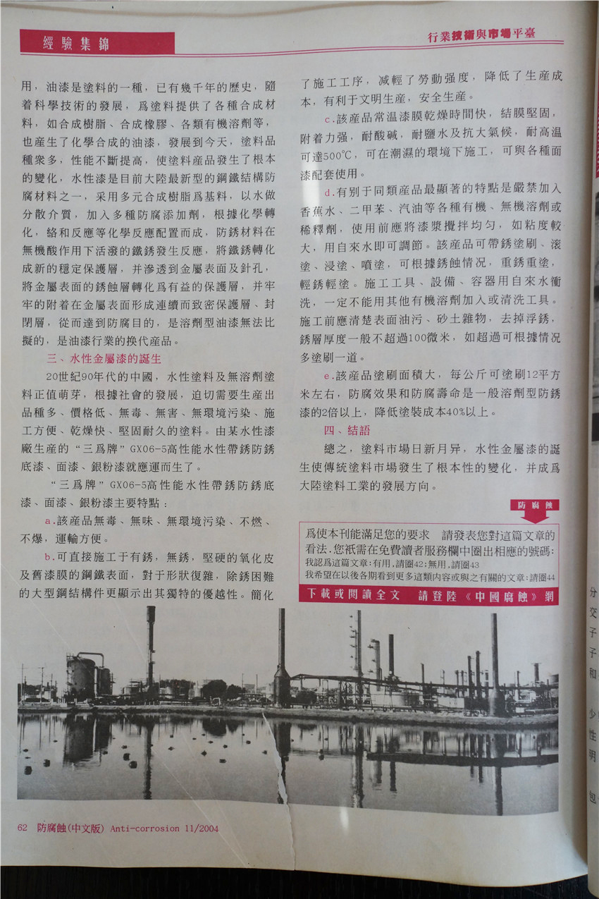 徐州市水性漆厂成立于1990年,产品自主研发填补国内水性工业空白。徐州市三为水性漆科技有限公司与中国矿业大学联合成立水性漆研发中心,从韩国尚庆大学引进国际纳米学者博士后姜继森教授为我公司技术总经理,专注水性纳米应用。三十余年来硕果累累,先后承接两 次 国 家 级 星火计划,中小企业技术创新基金,多项国家发明专利授权并在国家专利局“国际专利博览会”国际专利博览会中荣获创新奖与金奖,全国军民融合企业,《CCTV工匠精神》企业,国家生产力促进中心评为中国好技术,获“中国节能环保创业应用大赛”创新应用奖,中国企业诚信经营示范单位,江苏省民营科技企业,中船重工涂装专业委员会成员,《中国修船》编委,多次在 国 家 级 期刊发布学术论文,通过中国船级社检测,通过中国铁道部科学院检测。?